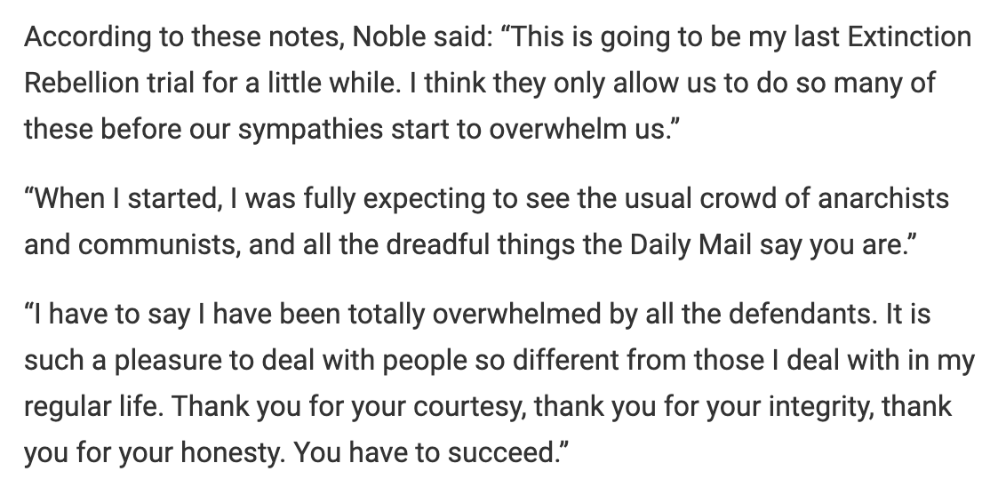 Judge's comments in support of Extinction Rebellion in trial of 6 https://leftfootforward.org/2020/01/judge-reportedly-tells-extinction-rebellion-activists-you-have-to-succeed-while-sentencing-them/ … No media were present at the sentencing; recording isn't allowed but a friend of one of the defendants in the public gallery made notes of deputy district Judge Noble’s sentencing remarks.pic.twitter.com/PrzJGzOGy2