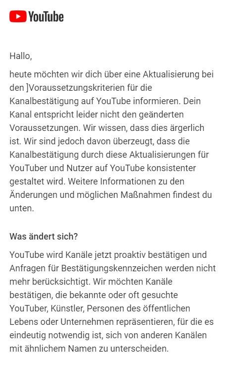 Ich hab seit Jahren einen verifizierten Kanal auf Youtube und ab Oktober wird mir der Haken einfach so weggenommen. Wo ist der Sinn?! @YTCreatorsDEpic.twitter.com/84zE0aIDWn