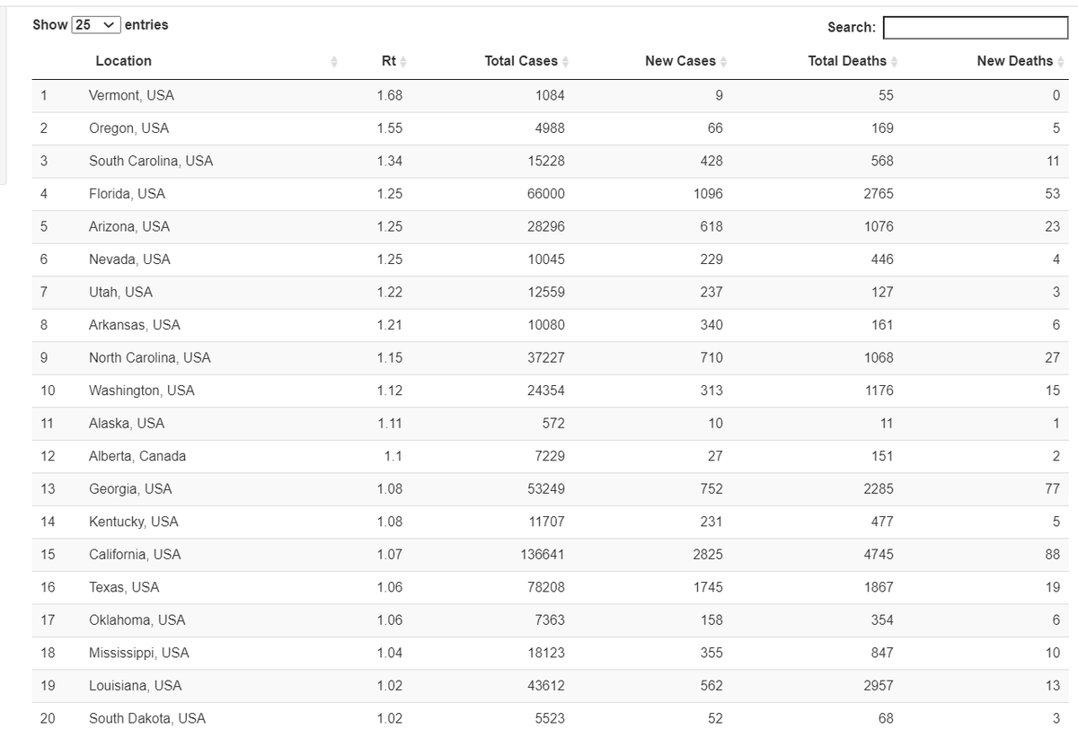 Estimated Rt values are also provided in a table below the map that can be sorted in ascending or descending order. Here are the top 20 states currently w/ the highest estimated spread rates(highest Rt’s using data up to 6/9), including VT, OR, SC, FL, AZ, NV, UT, AR, NC, WA(4/)pic.twitter.com/VLamZOuHMZ
