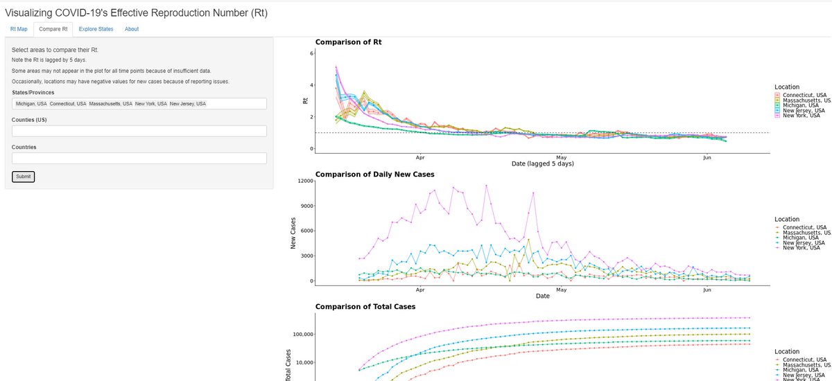 On the Rt-map page, choosing resolution=US counties shows estimated Rt map for about 1200 counties that have sufficient data. When #s of daily new cases are small or there are single day spikes, estimated Rt's might not be stable. Caution is needed. Check both Rt & case curvespic.twitter.com/Y4Uiqs1IGV