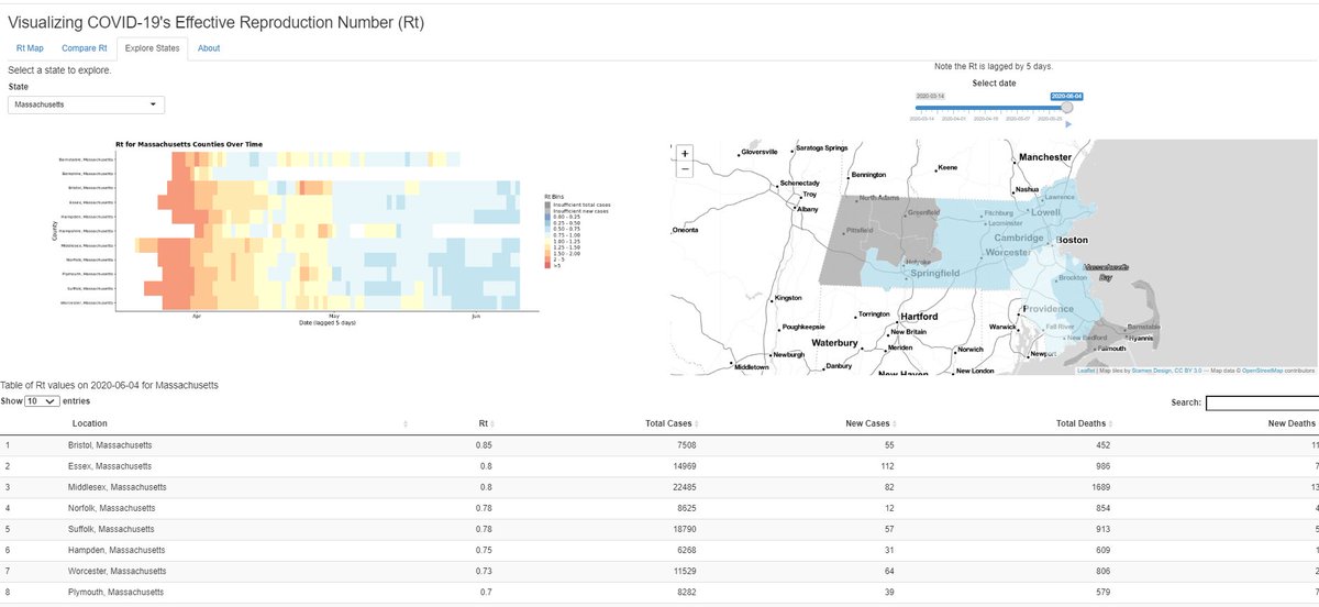 Visit the Explore State tab to compare the Rt trajectories between different counties within the same state. Here is the comparison between the counties in the state of MA. The ranked counties by Rt-values are given in the table below the mappic.twitter.com/yr8cDhng5n
