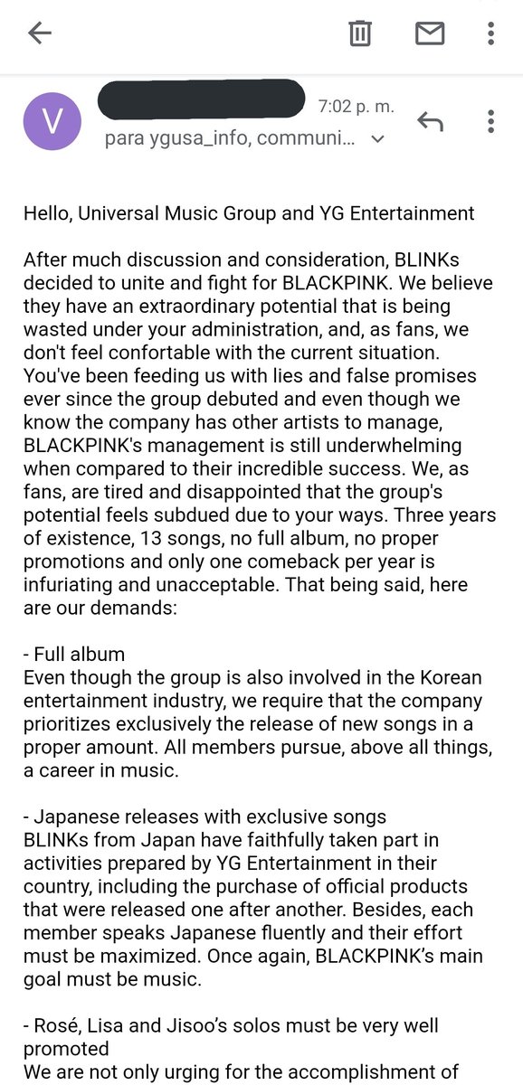 el propósito de esto es buscar mejor trato para blackpink sabemos q yg no ha hecho caso como tal cada q blink hace algo así pero no por eso debemos parar porq a fin d cuentas todo esto es por blackpink y les tomaría menos de 10 minutos mandar los correos