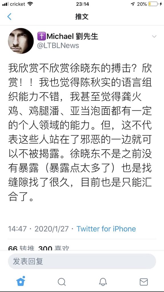 前几天上不了在外网,昨天能上了,我没有陈律师的胆量,我只能声援他,2020注定多灾多难~愿大家保重,我只能做我自己,我不会改变我的初衷,我的能力有限,我先保护好我的家人。很多事我也会用行动来表现的pic.twitter.com/shdS81wdv6