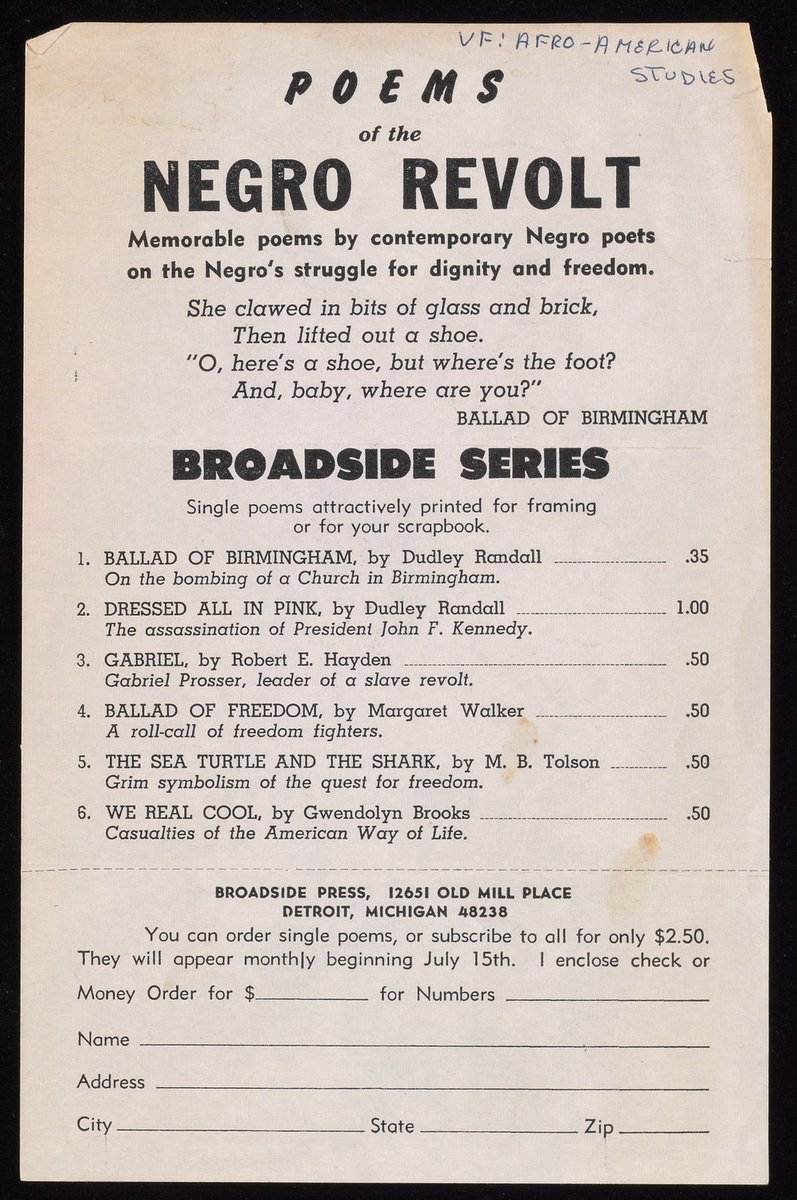 Broadside Press (Detroit, Michigan), Advertisement. Poems of Negro Revolt, including Ballad of Birmingham : on the bombing of a church in Birmingham / by Dudley Randall. Detroit, Mich. : Broadside Press, 1965. https://bit.ly/2t39XW9
