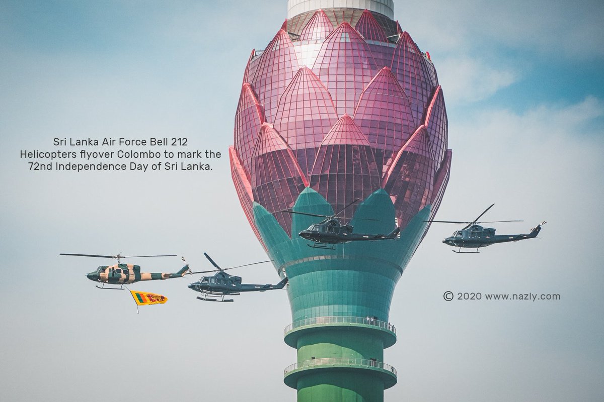 Sri Lanka Air Force Bell 212 Helicopters flyover Colombo Lotus Tower to mark the 72nd Independence Day of Sri Lanka. Pic by :