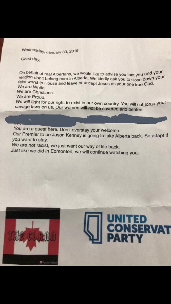 In the last few days, this hateful message was dropped at the Markaz Ul Islam, a beautiful mosque in Edmonton. We are shocked by the flagrant display of white supremacy that has now literally arrived on our doorsteps. (1/3) pic.twitter.com/v6NpcdZtCT