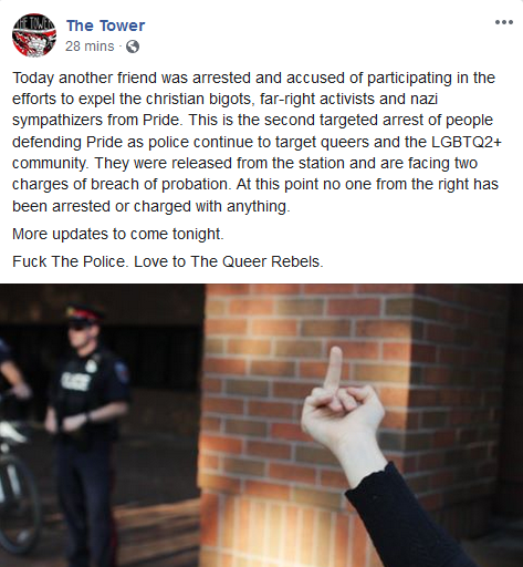 2nd arrest made in Hamilton on a defender at the pride festival. These ppl took great care to remain defensive using pushing and open hands, pulling ppl off on the ground. Hamilton police were not invited to participate in pride and this might be a reason.https://twitter.com/VestsCanada/status/1143279404782632961 …