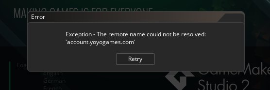 I was able to get to the forums, site, etc while at work, but I get home and can't reach them and now GMS2 refuses to login either. I just get the "remote name could not be resolved: http://accounts.yoyogames.com ".