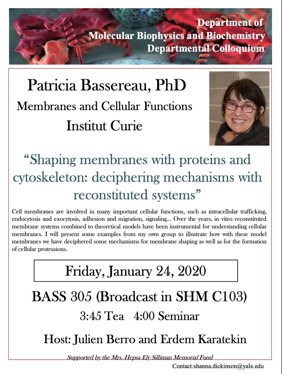 Join us for Patricia Bassereau's talk on “Shaping membranes with proteins and cytoskeleton: deciphering mechanisms with reconstituted systems” On Jan 24th at 4:00 in SHM C103. Come early at 3:45 for tea!pic.twitter.com/RA42WvTHxn