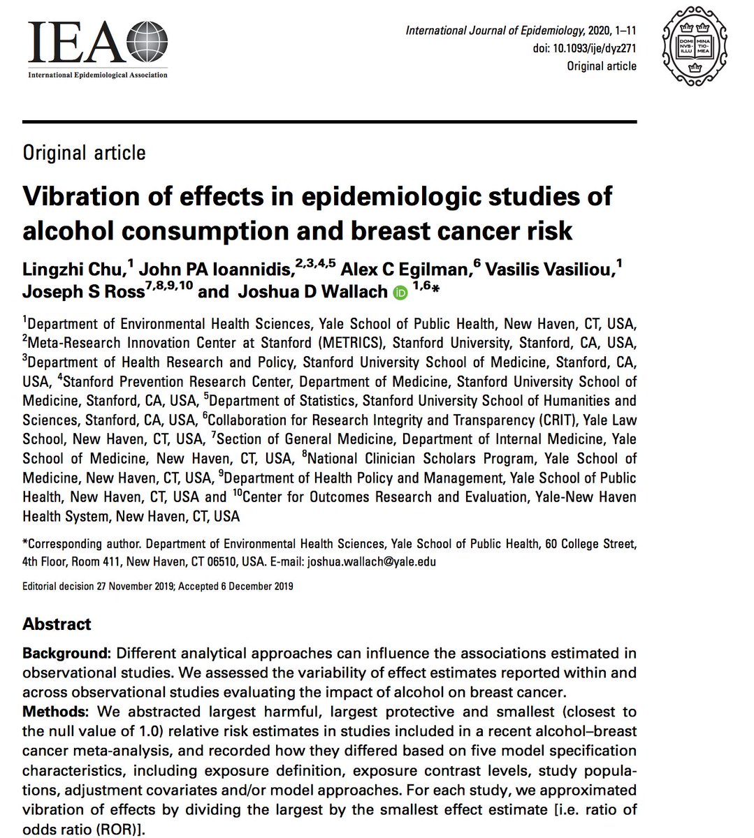 @YaleSPH students Our new paper in@IJEeditorial, by@YaleDeptEHS PhD student Lingzhi Chu, looks at the variability of effect estimates reported across studies evaluating the impact of alcohol on breast cancer 1/7 https://academic.oup.com/ije/advance-article/doi/10.1093/ije/dyz271/5714100#.XiihSbMT8Wh.twitter …pic.twitter.com/r2J4hSQ20x