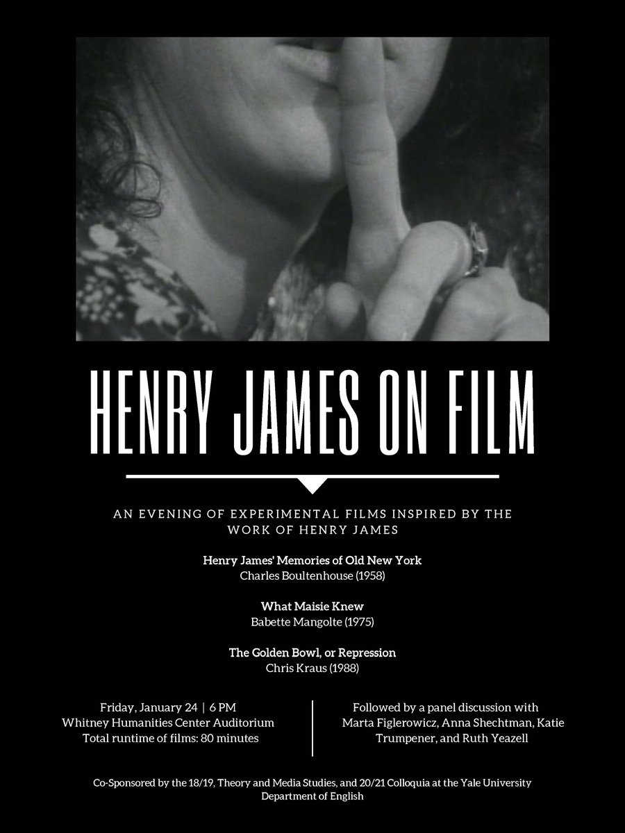 Friday, January 24 An Evening of Experimental Films Inspired by the work of Henry James Henry James’ Memories of Old New York, Director Charles Boultenhouse What Maisie Knew, Director Babette Mangolte The Golden Bowl, or Repression, Director Chris Kraus 6:00pm, Auditoriumpic.twitter.com/wgIF0QidUa