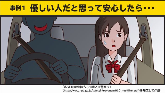 【SNSトラブル・事例①】SNSで知り合って仲良くなった人に悩みを相談▶「慰めてあげる」「迎えに行ってあげるよ」などと誘い出されて、連れまわされる被害に遭ってしまった▶誘拐や殺人等の重大な犯罪に巻き込まれてしまうケースもあります◀pic.twitter.com/cOLwEkYbPX