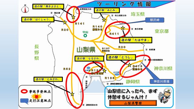 【二輪車事故防止情報】山梨県内の事故多発地点や走行注意箇所を県警HPで紹介しいます