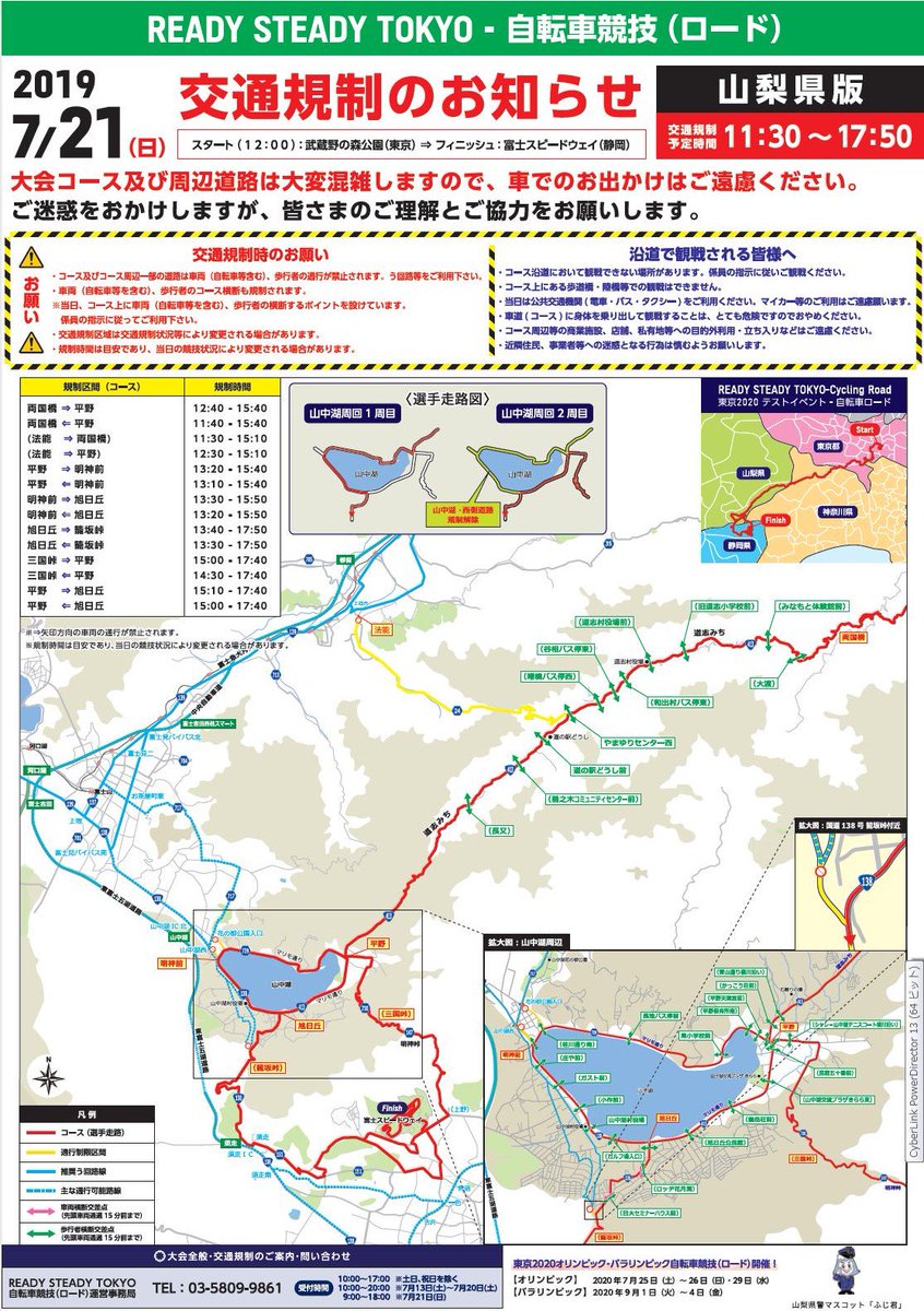 【交通規制】 7月21日(日)東京五輪自転車競技ロードレースのテストイベント「READY STEADY TOKYO-自転車競技(ロード)」が開催されます▶当日は道志、山中湖方面では大規模な交通規制が行われます▶ご理解とご協力をお願いします◀pic.twitter.com/AOpUNjoepj
