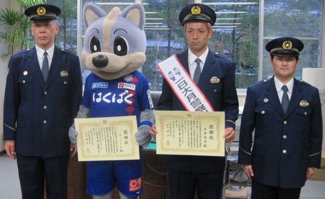 ヴァンフォーレ甲府の今津選手とヴァンくんを招き、犯罪抑止総合対策を実施