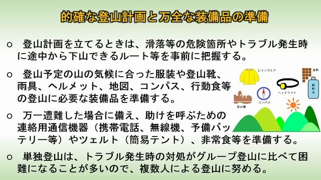 気象条件、体力、技術、経験、体調等に見合った山を選択し、登山日程、携行する装備品、食料等に配意して安全な登山計画を立てましょう