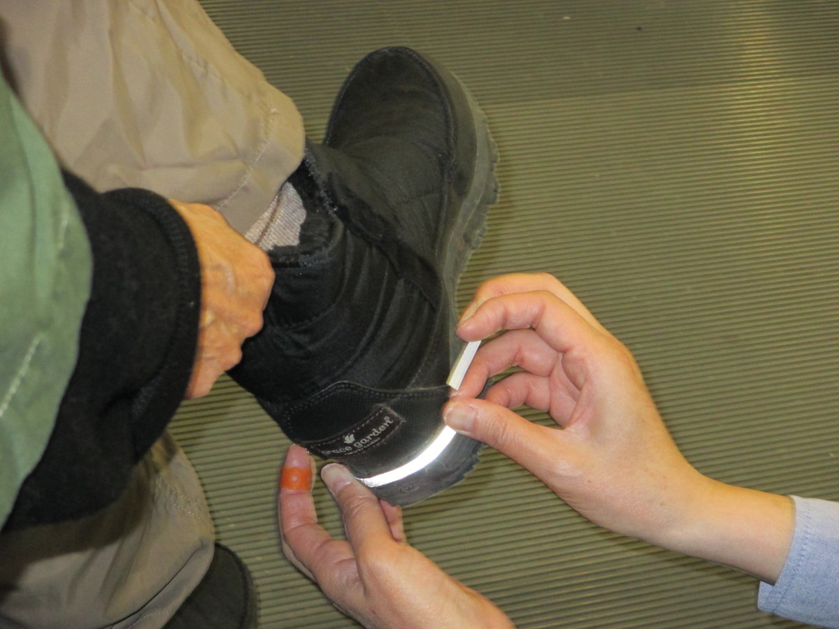 【心も靴も明るくね!】運転免許センターでは、春の全国交通安全運動期間中、免許更新や自主返納をした高齢者へ、靴に貼る反射シールをプレゼントしました