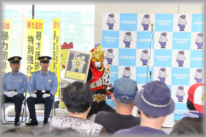 【サクライザーも応援している】改正山梨県暴力団排除条例施行記念式典後には、山梨ご当地ヒーローのサクライザーが登場