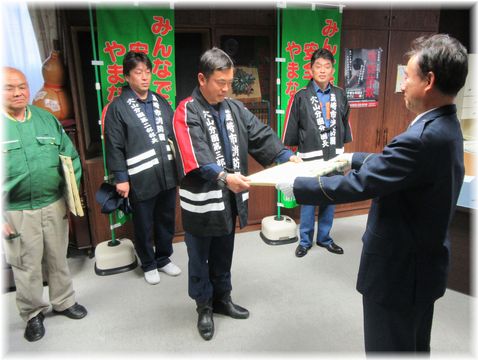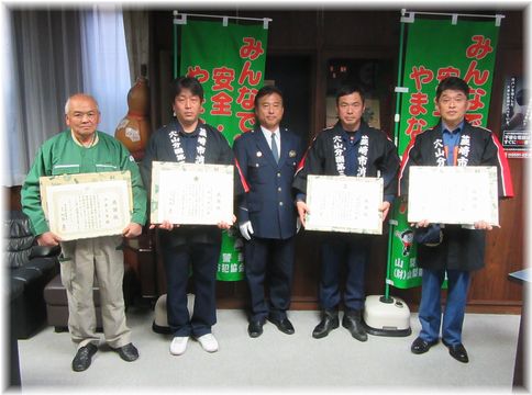 【韮崎署から】行方不明者の捜索活動に加わり、無事発見した地域住民の伊藤さん、韮崎市消防団穴山分団の細窪さんと嶋津さん、並びに穴山分団(小泉分団長)に対して韮崎警察署長から感謝状を贈呈しました