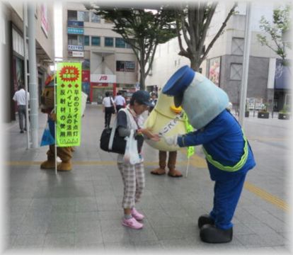 反射材大使に任命された「富士の国やまなし観光キャラバン隊長」の『武田菱丸』、「みなさまの縁をとりもつ隊」のマスコット『とりもっちゃん』も参加して、反射材の着用等を呼びかけました