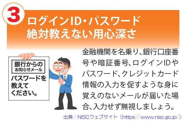 【情報セキュリティ対策9か条③】 ログインID・パスワード 絶対教えない用心深さpic.twitter.com/XDl29eWUBS