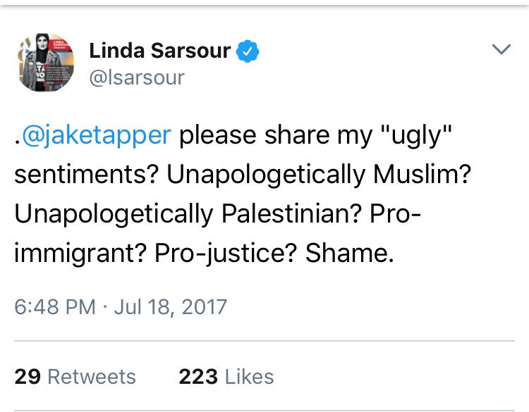 Linda Sarsour's trying to figure out what her ugly sentiments are. I'll help. For starters, her attack on @Ayaan. https://mobile.twitter.com/lsarsour/status/887443869180342272 … pic.twitter.com/ZuheQlD0FA