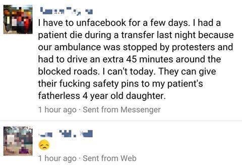 #PresidentTrumps1stTantrum Patient, father of 4 year old, dies in ambulance during transfer thanks to protestors blocking roads.pic.twitter.com/jJDrNZvBWd
