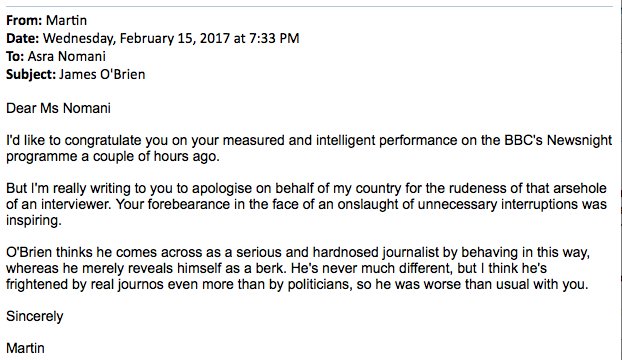 Here is a kind note I just received from Martin apologizing for behaviour of @BBCNewsnight @mrjamesob. Why did you invite me on @BBC?pic.twitter.com/2SBkxuImJD