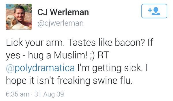 CJ Werleman has so strong opinions that change based on what brings him money. He hated Arabs sincerely back in 2009 (though he claimed he hated only religions, but it seems based on his old tweets he just hated the people, not only religions). Check this out. 1/2pic.twitter.com/jtEO1MM7wv