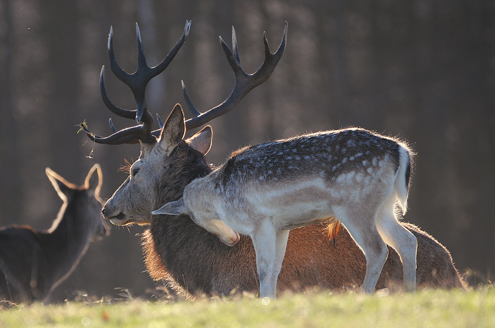 One doe acts as a look out, while the others graze at sunrise. Fallow deer are amazingly cooperative herd animals.