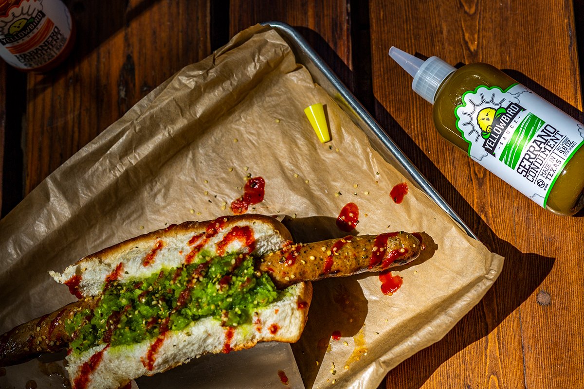 @YellowbirdSauce Dog - a pork hot dog mixed w/ habanero Yellowbird hot sauce, topped w/ neon pickle relish mixed w/ serrano Yellowbird hot sauce, & finished w/ jalapeño Yellowbird drizzle. Get it tonight between 5-9pm and get a free swag bag from Yellowbird!pic.twitter.com/EXIFcZTery
