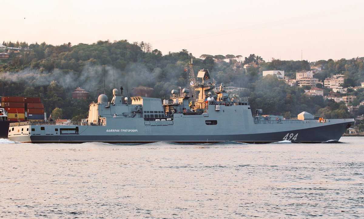 Redeployed to Mediterranean after 86 days & armed with Kalibr SS-N-27 missiles, Admiral Grigorovich class frigate #ВМФ #ЧФ Admiral Grigorovich departed BlackSea 03:00Z and transited Bosphorus towards Mediterranean. Turkish CoastGuard TCSG15 monitored the frigates.pic.twitter.com/oCd8rYsuPn