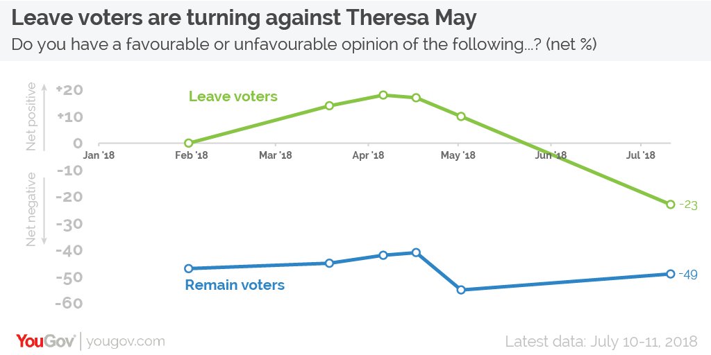 The slump in Theresa May's favourability ratings is coming from Leave voters. While in May she was on +10 among this group, she now stands at -23 https://yougov.co.uk/news/2018/07/12/theresa-mays-favourability-score-plummets-new-low/?utm_source=website_article&utm_medium=twitter&utm_campaign=favourability_july_2018 …pic.twitter.com/iUbDjAWqfM