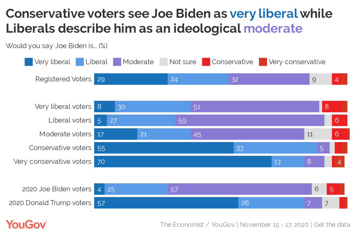 55% of conservative voters see Joe Biden as very liberal while 59% of liberal voters describe him as an ideological moderate. https://today.yougov.com/topics/politics/articles-reports/2020/11/19/expectations-joe-biden-presidency?utm_source=twitter&utm_medium=website_article&utm_campaign=Biden_expectations …pic.twitter.com/C11fNfnTDC