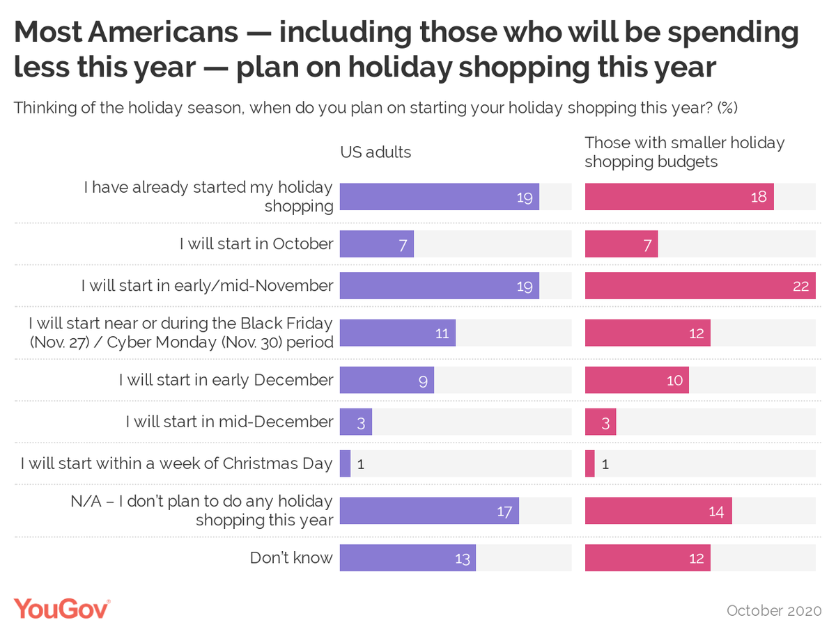 Most Americans (69%) — including 74% of those with smaller budgets — plan on shopping online or in-person at some point this holiday season. https://today.yougov.com/topics/media/articles-reports/2020/11/19/despite-budgets-americans-holiday-shopping?utm_source=twitter&utm_medium=website_article&utm_campaign=holiday_shopping_despite_budgets …pic.twitter.com/NSiI6ukvHx