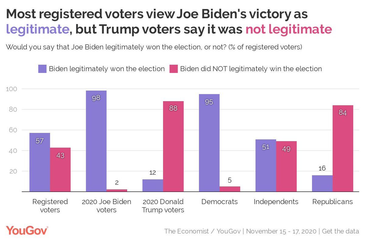 Most voters view Biden's victory as legitimate, but Trump voters say it was not. LEGITIMATE All voters - 57% Biden voters - 98% Trump voters - 12% NOT LEGITIMATE All voters - 43% Biden voters - 2% Trump voters - 88% https://today.yougov.com/topics/politics/articles-reports/2020/11/19/trump-voters-biden-poll?utm_source=twitter&utm_medium=website_article&utm_campaign=trump_voters_biden …pic.twitter.com/HvuyYRrnYq