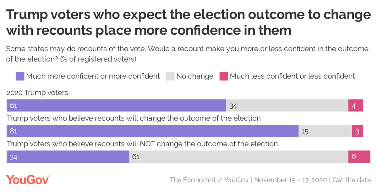 Trump voters who believe recounts will change the outcome of the election (81%) are more confident than Trump voters overall (61%). https://today.yougov.com/topics/politics/articles-reports/2020/11/19/trump-voters-biden-poll?utm_source=twitter&utm_medium=website_article&utm_campaign=trump_voters_biden …pic.twitter.com/b5HeXZIvHY