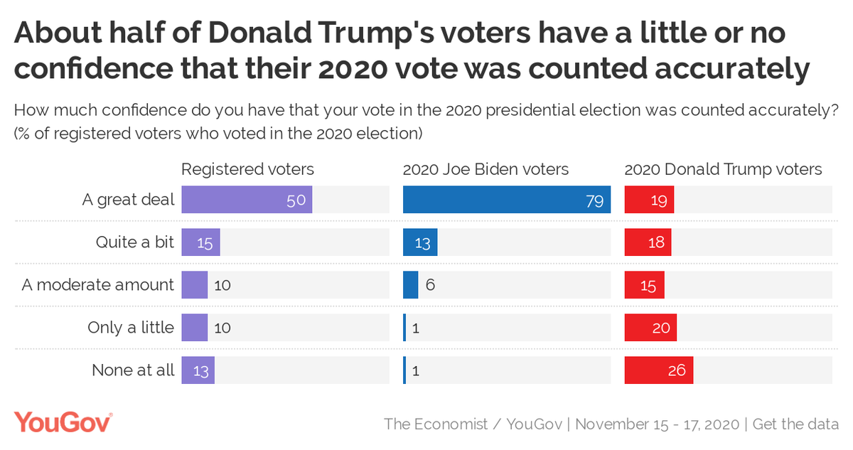 About half of Trump voters have little (20%) or no confidence (26%) that their 2020 vote was counted accurately. https://today.yougov.com/topics/politics/articles-reports/2020/11/19/trump-voters-biden-poll?utm_source=twitter&utm_medium=website_article&utm_campaign=trump_voters_biden …pic.twitter.com/sLK5bHABDs