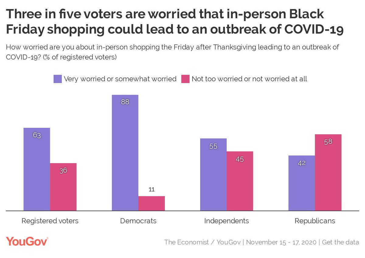 #BlackFriday shopping could lead to a#COVID19 outbreak... Registered voters - 63% Democrats - 88% Independents - 55% Republicans - 42% https://today.yougov.com/topics/politics/articles-reports/2020/11/20/only-9-voters-plan-shop-store-black-friday?utm_source=twitter&utm_medium=website_article&utm_campaign=black_friday …pic.twitter.com/ch5rYSinOA
