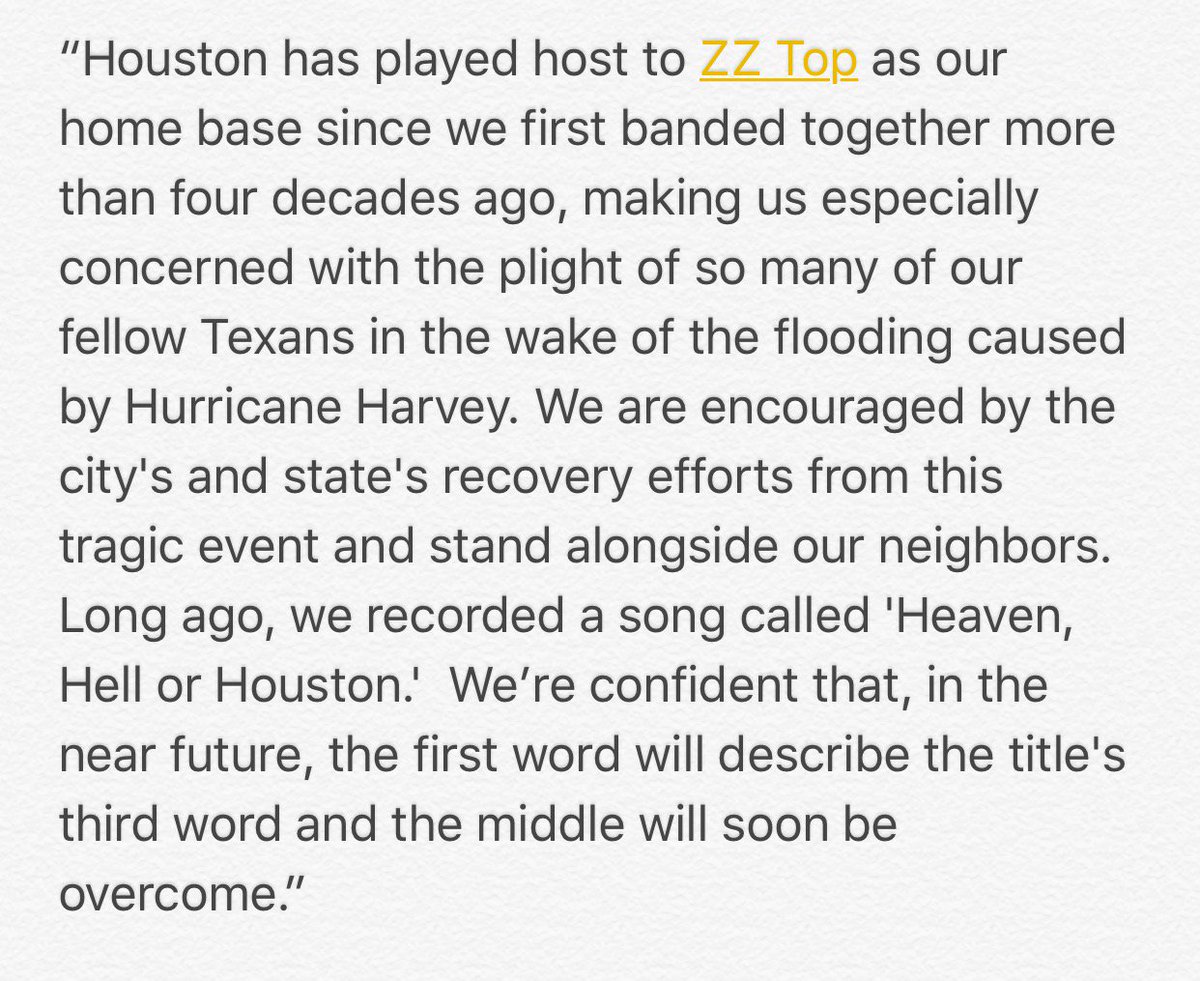 For Houston...Heartfelt & well said, ZZ Tops! You guys show as much feeling & class in your remarks as you do in your music! Hear, here!
