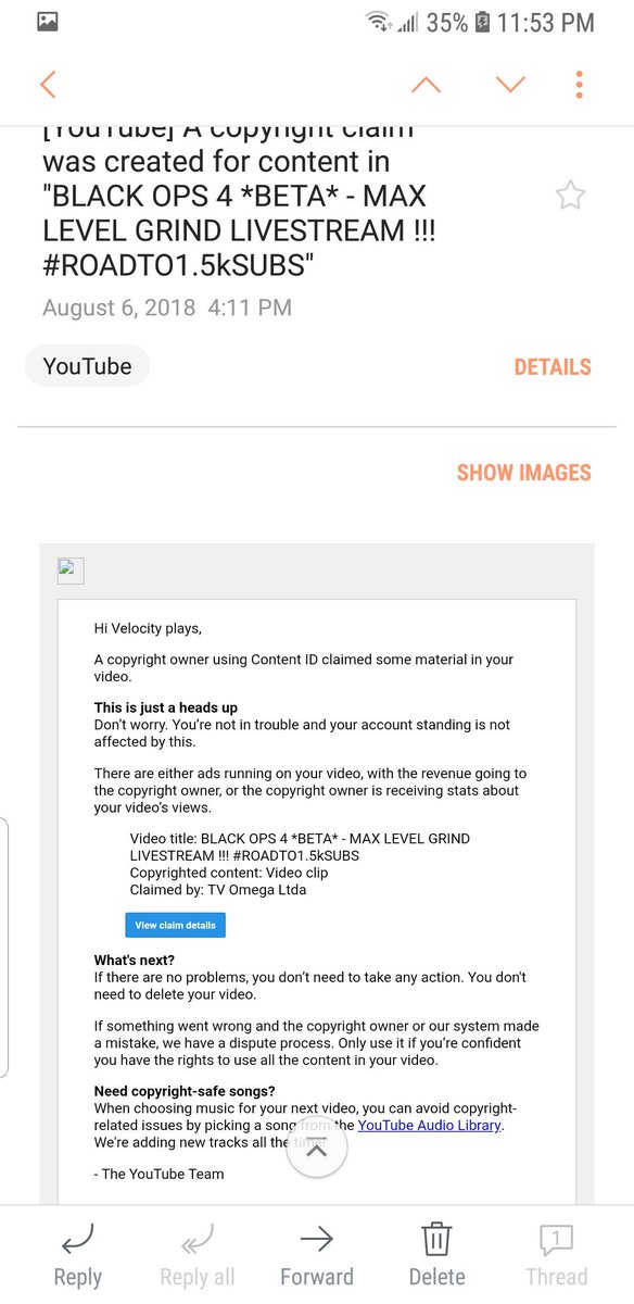 @YTCreators @YouTube @TeamYouTube absolutely ridiculous how TV Omega Ltda can just claim a visual content strike on my COD: black ops 4 without owning any content. Makes no sense. I have disputed the claim so I hope you all resolve this issue. ( I'm having this issue like the guypic.twitter.com/cmT1Gek0jZ
