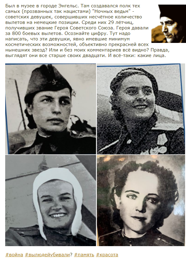 К посту про "ночных ведьм" немедленно явился скептик (как, к слову, и к любой программе "Уроки русского" о войне) и через губу написал, что у Покрышкина менее четырёхсот вылетов, чего я тут несу про 800 вылетов "ночных ведьм", что за бред.pic.twitter.com/5tIbkxXSX8