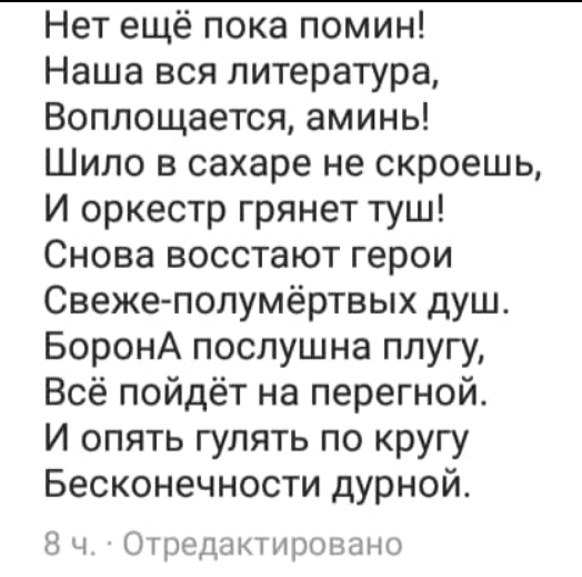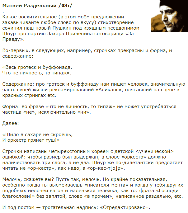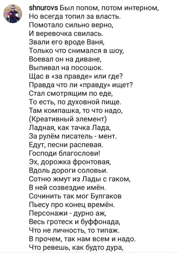 Та Господи. Серёжа Шнуров написал стихи про нас. «Писатель-мент» и все такое. Так тронут. Минут сорок потратил, наверняка. Рифмовал (очень плохо), грыз ручку. 30 тысяч лайков уже. Спасибо, миленький.
