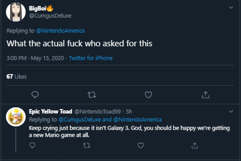It's a joke on how a lot of Nintendo fans will demean or shut down people who critique Nintendo's products or practices. Even in the case that these criticisms are well-founded/justified.