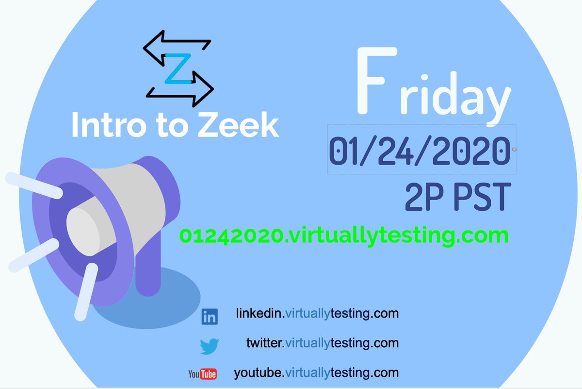 Please register for — Intro to Zeek/Bro — on Jan 24, 2020 2:00 PM PST Registration: http://01242020.virtuallytesting.com