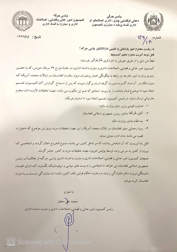 امریکا کې افغان سفیره رویا رحماني، پخوانی مالیې وزیر همایون قیومي، د مالیې وزارت مشاورین یمانظامي او څرګند د پارلمان عدلي او قضایي کمېسیون له لورې څارنوالۍ ته معرفي شوي دي لامل یې امریکا کې د تعمیر د دیوال پر جوړولو زیات لګښت دیpic.twitter.com/2C22ryGoJM