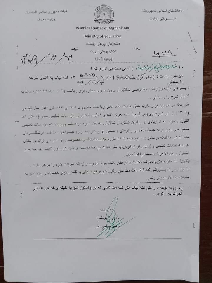د خصوصي ښوونځیو زده کوونکي دې د قرنطین د میاشتو فیس نه ورکوي.pic.twitter.com/DbRycz0JI7