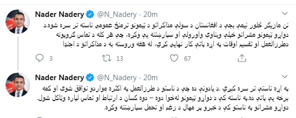 دا نو بیخي جالبه ده په لومړي ځل د حکومت د مذاکراتي پلاوي ویاند نادر نادري او طالبانو د پلاوي ویاند نعیم وردګ بیخي یو ډول ټویټونه کړي هیله ده چې نظریات هم یو شيpic.twitter.com/ebWhzAVWil