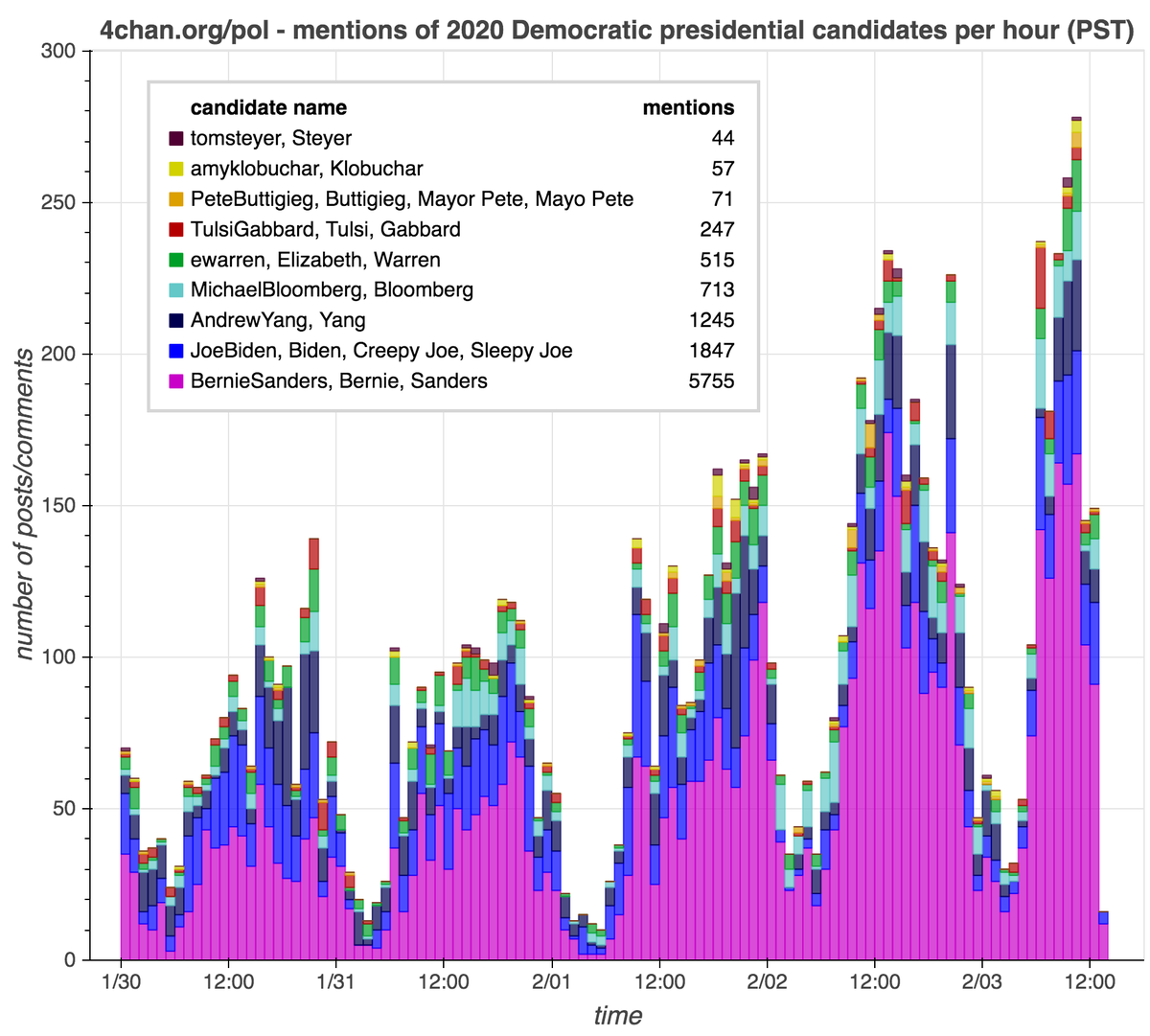 As we head into the Iowa caucuses, 4chan's /pol/ forum has all but forgotten its former interest in Tulsi Gabbard; Bernie Sanders, Joe Biden, and Andrew Yang are the most frequently discussed candidates ("discussed" implies neither support nor opposition.) cc: