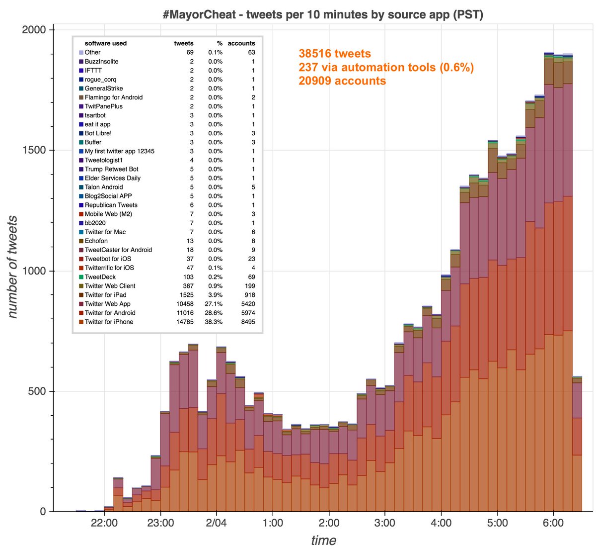 #MayorCheat is trending due to "Russian bots." Although proving a negative is impossible, the evidence doesn't appear to support these claims for multiple reasons. First, very little of the traffic looks automated. cc:@ZellaQuixotepic.twitter.com/N5xqvmxDsA